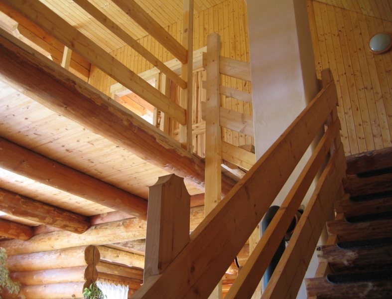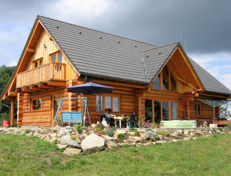 Rodinný srubový podkrovní dům s prostornými místnostmi terasou, balkony a galerií.